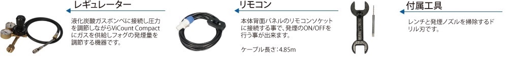 リモコンが付属されていますので、発煙のON/OFFが離れたところから行う事も可能です。発煙量はあらかじめレギュレーターで調整しておきます。
