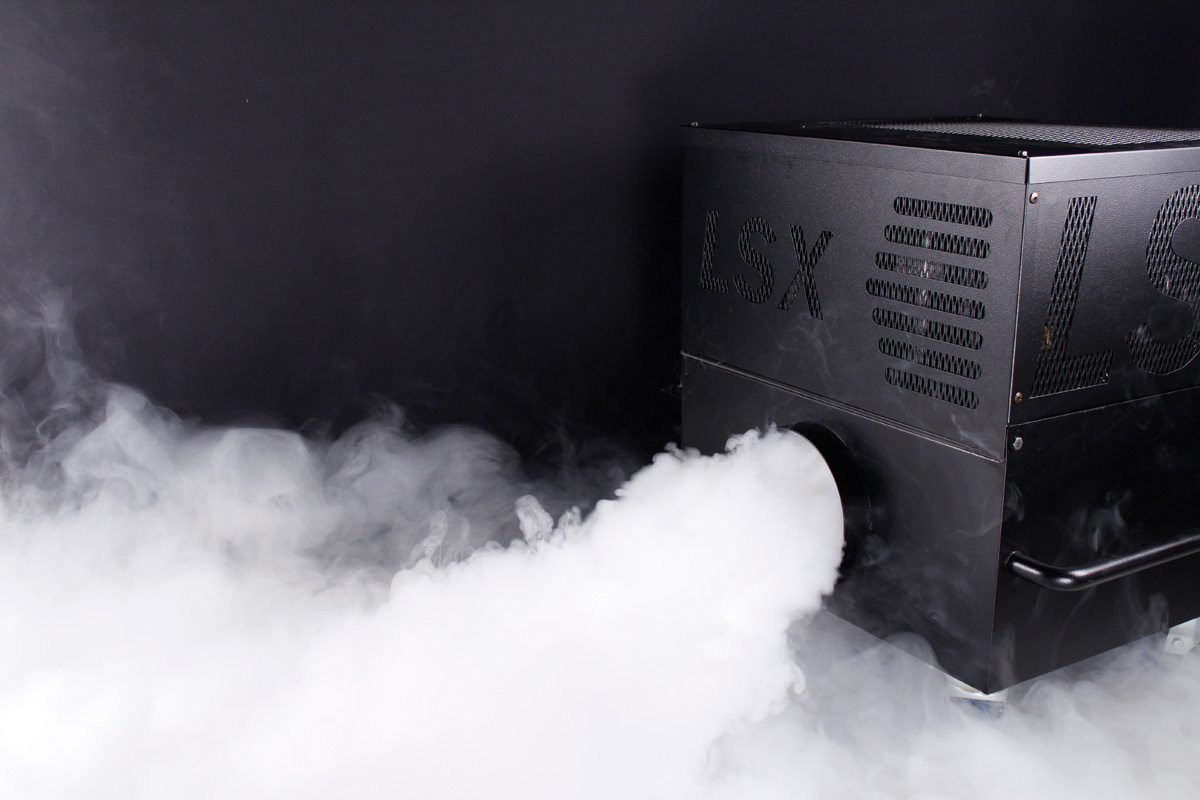 LSX は、家電の冷蔵庫と同様の冷却機能を搭載したマシンで、Ultratec 社製G3000 フォグマシンを設置する専用のプレート付きですが、その他のフォグマシンとご使用頂くことも可能です。フォグマシンの煙を背面パネルの煙注入口に噴出すれば、冷却されて床面を漂うロースモークとなって前面の噴出口から発煙することができます。LSG のようにCO2 を使って冷却する必要もなく、電源さえ準備すれば手軽にロースモークを作り出すことができるので、ランニングコストを抑えたい現場や、システムを簡素化した場合に最適です。